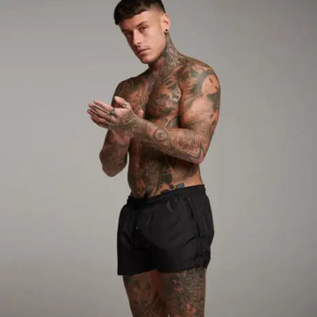 These men's swim shorts feature a short length and matte outer surface with a straight-leg cut. The silhouette maintains a non-tapered shape, paired with an elastic waistband for size flexibility. A thin inner lining provides layering structure, and side pockets allow for small item storage during casual wear.