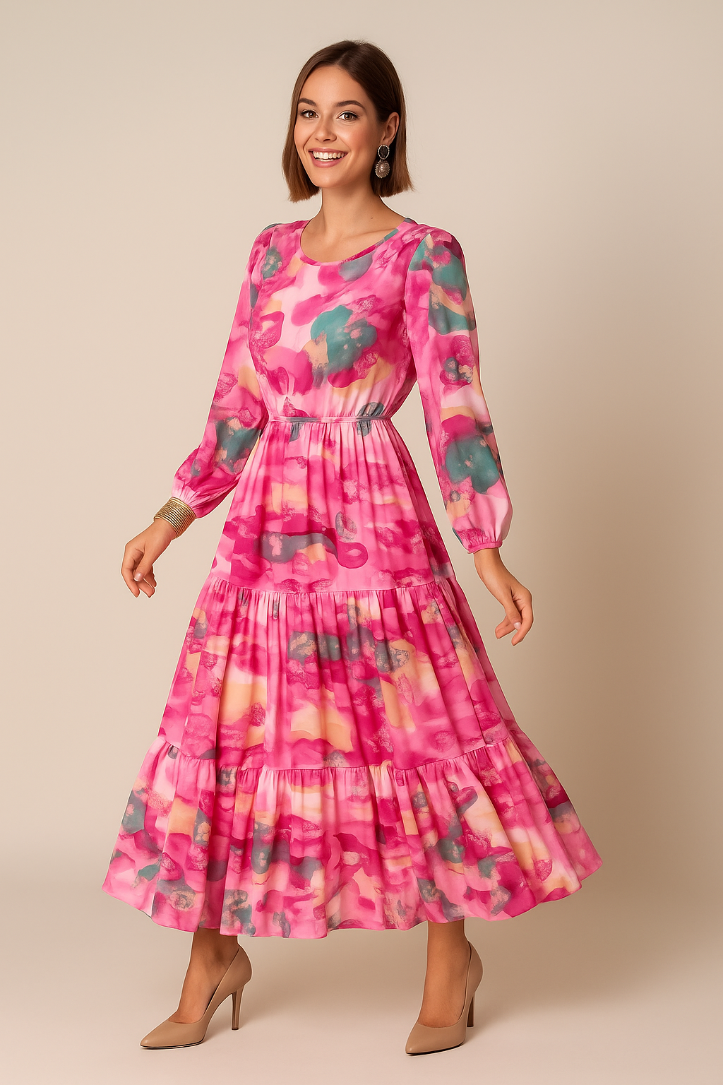 This midi-length dress presents a gently contoured silhouette with layered elements and sheer long sleeves, providing a structured outline suitable for warm-weather settings. The wrap-style neckline and adjustable waist tie allow for a personalized fit, while the gathered skirt tiers enhance visual depth and contour. Created for those who appreciate balanced outlines and clean detailing, this piece merges clarity with minimal accents.