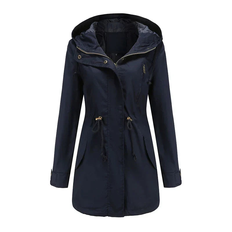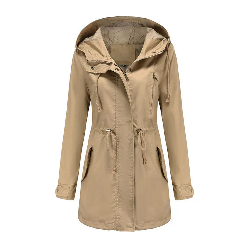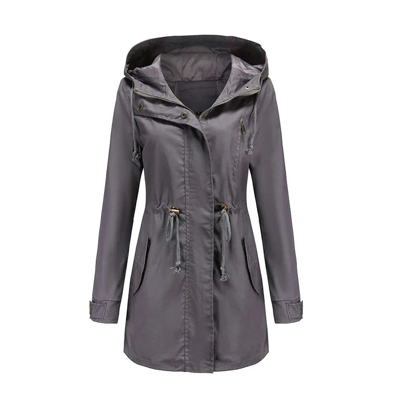 Questa giacca con cappuccio e zip è uno strato esterno pratico per l'uso quotidiano. Presenta una forma rilassata, offrendo un'opzione adatta per le donne che desiderano una copertura semplice contro il maltempo senza ingombro eccessivo.